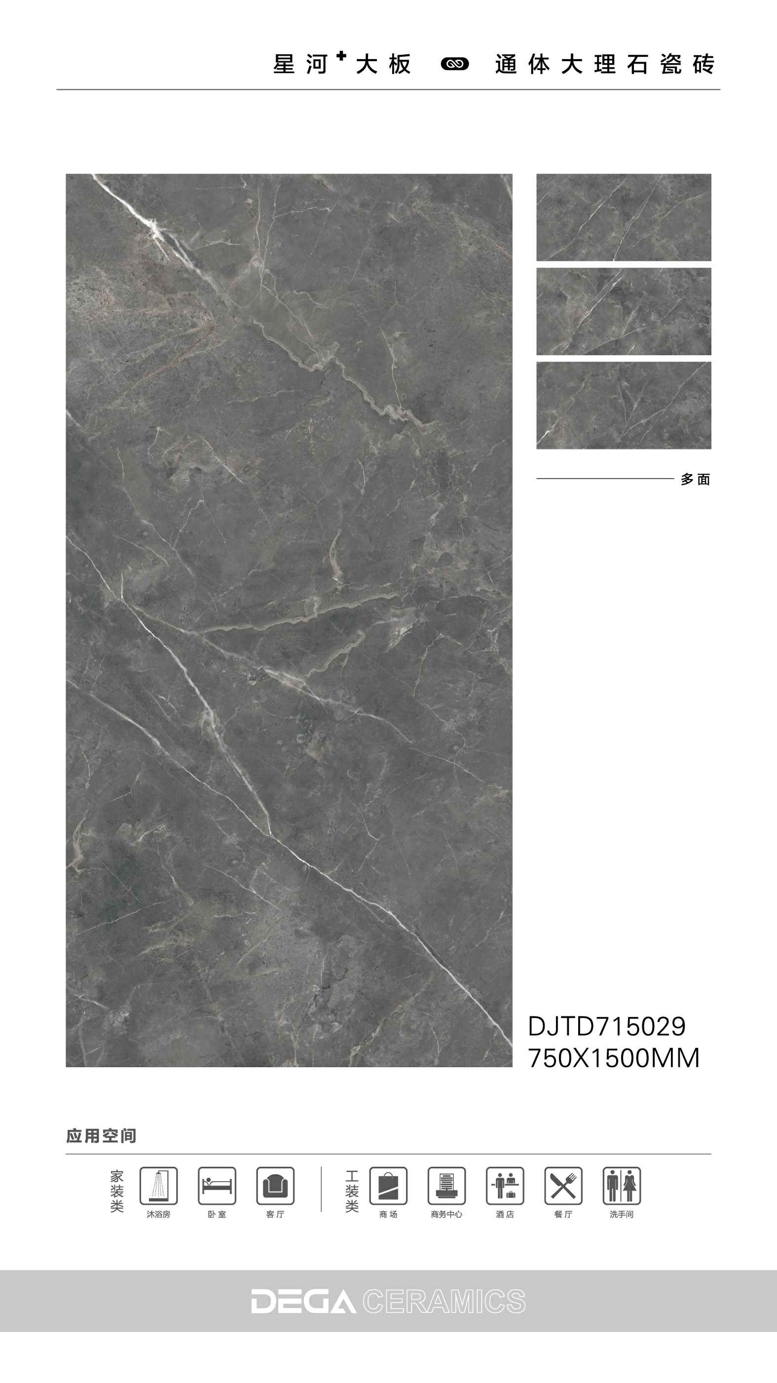 从规格形式的选择、纹理的趣味,到丰富内涵的表现、文化的传承等…… 都是她的每一侧面,在750X1500MM创造的舞台中央,是属于一片瓷砖传奇剧的演出。